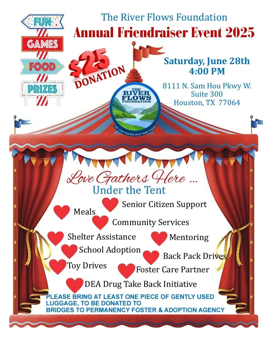 You don’t want to miss this night of games, raffles, plinko and bingo. We will be having hamburgers, hotdogs and chips. Tickets are $25 each and sales directly benefit The River Flows Foundation programs & services.